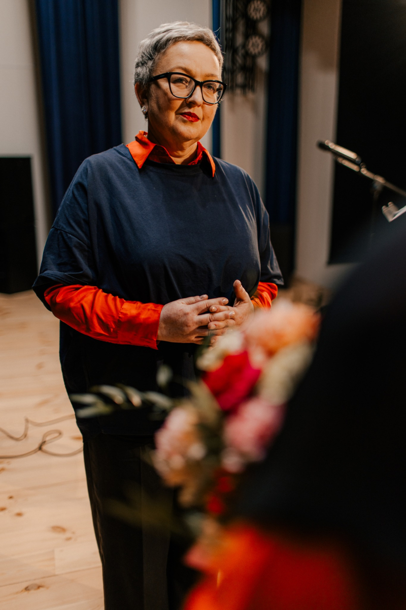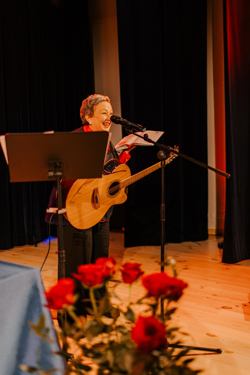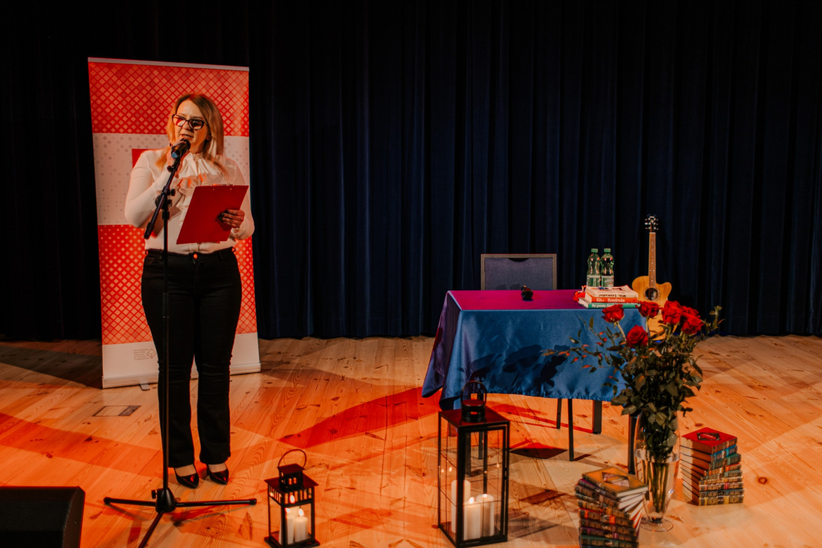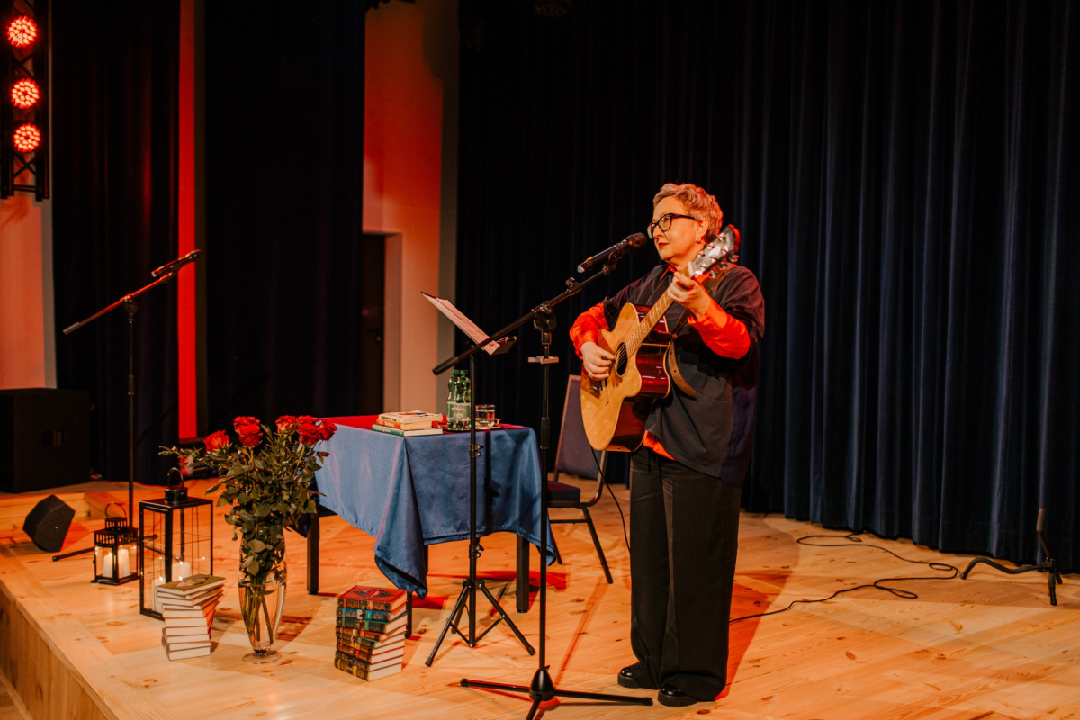 Po tej literackiej części wieczoru przyszedł czas na muzykę. Na naszej scenie wystąpiła Mariola Konieczna – śpiewająca poetka, kompozytorka i wokalistka związana z nurtem piosenki literackiej i poetyckiej. Jej twórczość to niezwykłe połączenie autorskich tekstów z komponowaną do nich muzyką – subtelne, refleksyjne i pełne emocji utwory, które trafiają prosto do serca.